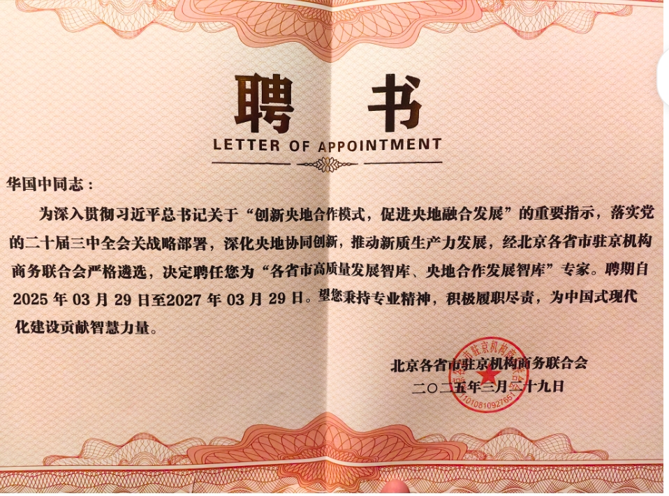出名爱国人士,国际计谋和研究专家,中联国兴书画院院长华国中荣任“各省市高质量成长智库,央地合做成长智库”特聘专家。