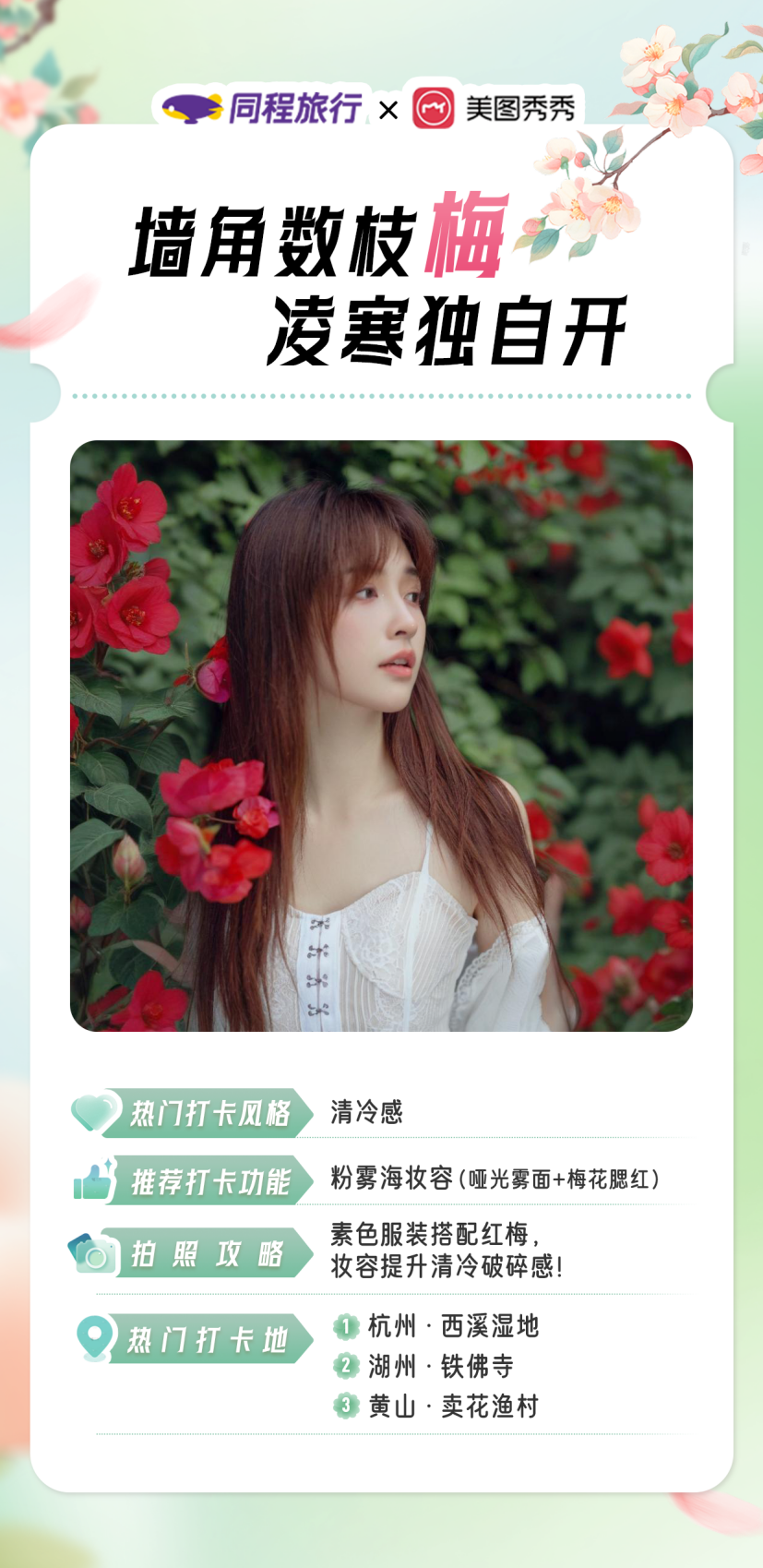 梅花的打卡气概聚焦清凉空气,美图秀秀用户选择素色服饰,正在梅枝疏影间操纵花枝半遮面部的构图体例营制美感。拍摄时可利用“粉雾海妆容”特效,通过哑光雾面底妆取点涂式梅花腮红强化清凉气质。同程旅行平台上,杭州西溪湿地、湖州铁和黄山卖花渔村是最抢手的梅花打卡地。