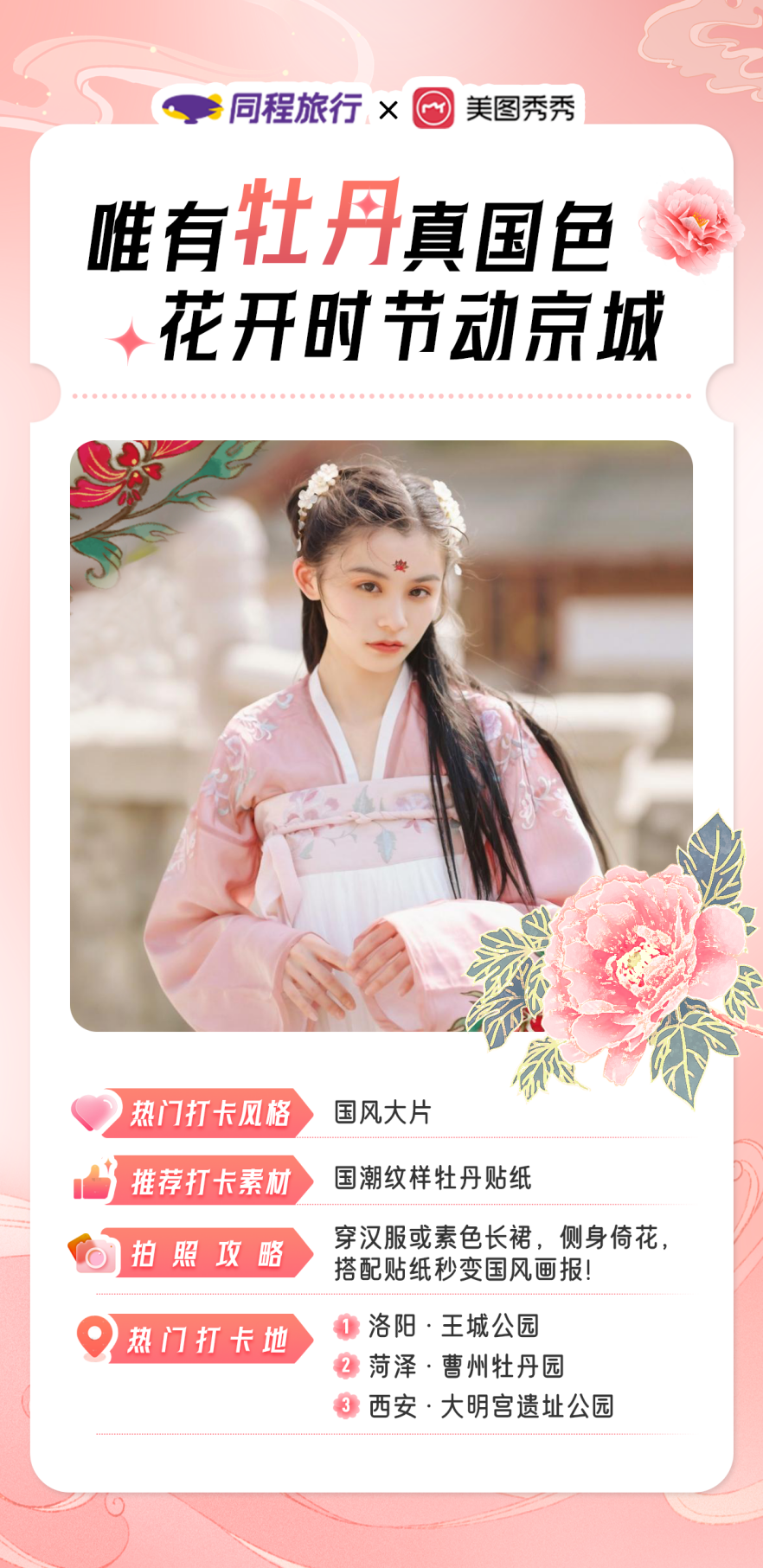同程旅行数据显示,洛阳是平台热度排名第一的牡丹花赏花目标地,本年3月洛阳旅逛搜刮热度环比上涨37%。清明假期、上海等城市前去洛阳的火车部门抢手车次已售罄。而从赏花景区热度看,洛阳王城公园、菏泽曹州牡丹园、西安大明宫遗址公园是最抢手的牡丹赏花景区。牡丹花取国风可谓绝配,浩繁旅客身着保守服饰,正在牡丹花下留影。美图秀秀平台推出的国潮纹样牡丹贴纸,更帮力旅客注释新中式美学。