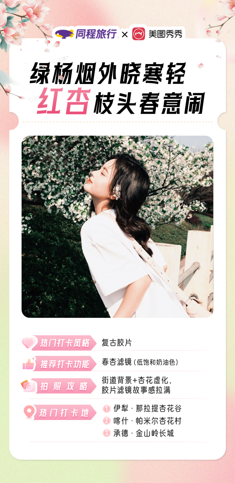 新疆的杏花从题逛成为近年来国内抢手的中长线赏花线。伊犁那拉提杏花谷和喀什帕米尔杏花村的杏花和村子交错,吸引全国各地的旅客前去。此外,承德金山岭长城狼烟台旁杏花蜂拥,是京津冀周边居平易近春季赏花出逛的抢手景区。美图秀秀用户喜爱的复古风最适合杏花摄影打卡,分分钟复刻90年代文艺画报。