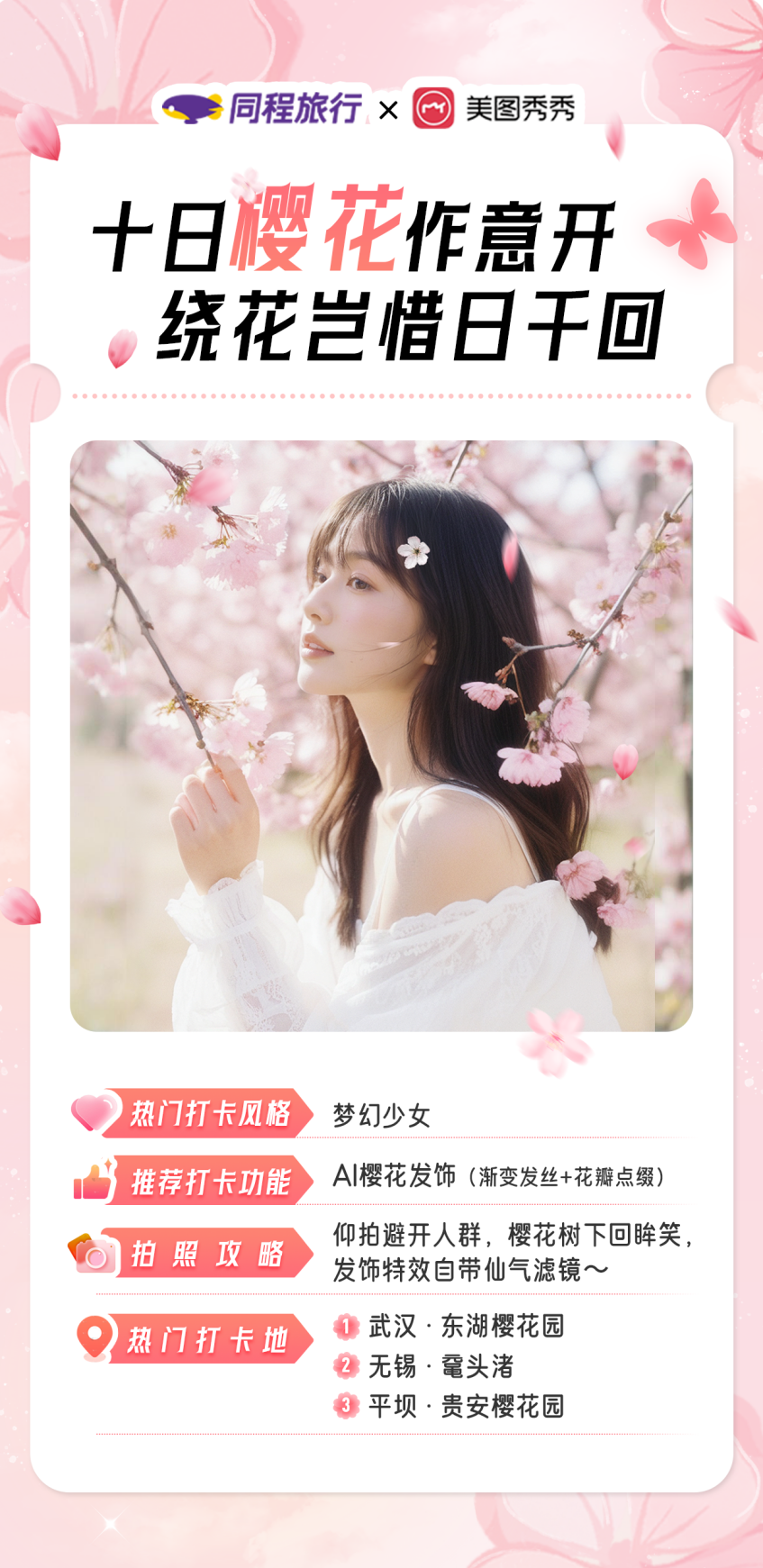 恰逢樱花季,美图秀秀为用户保举“梦幻少女”风打卡。旅客借帮“AI樱花发饰”特效,将渐变粉紫发丝取飘落花瓣叠加,仰拍镜头下回眸含笑,一键生成仙气十脚的樱花写实。同程旅行数据显示,武汉东湖樱花圃、无锡鼋头渚和贵安樱花圃赏樱热度最高,此中,无锡鼋头渚3月门票预订热度环比上涨超3倍。