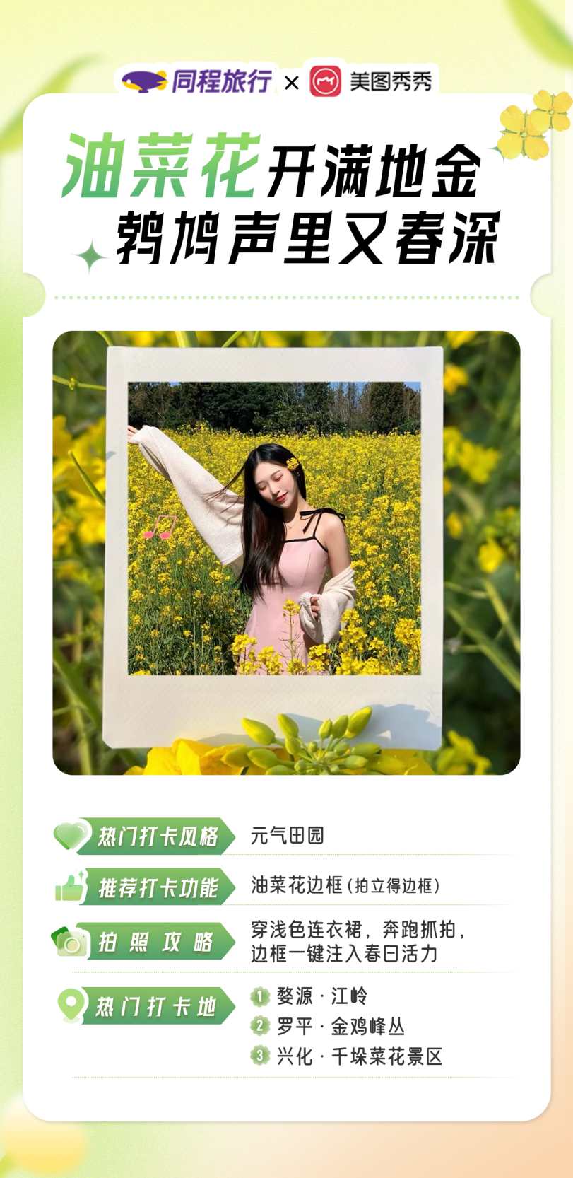 同程旅行平台上,油菜花抢手打卡地各具特色。江西婺源江岭的梯田花海参差如金毯铺展,云南罗平金鸡峰丛的喀斯特峰林取花田形成奇异地貌,江苏兴化千垛景区的水上花垛矩阵则可搭船拍摄船行花上的奇特视角。日出后2小时或日落前拍摄,温和光线让肤色取花海更显通透。美图秀秀为用户供给了“元气田园风”摄影窍门,浅粉等淡色系连衣裙,正在花田间奔驰、转圈时抓拍动态霎时,轻松营制清爽空气感。同程旅行也率领用户深切陕西汉中,开展汉中勉县油菜花节自驾勾当,勾当期间,用户沉浸式体验“车正在景中走,人正在画中逛”的田园风光,并品尝本地美食。此次自驾之旅由马达租车供给全程车辆支撑,让用户正在赏花的同时体验专业贴心的租车办事。