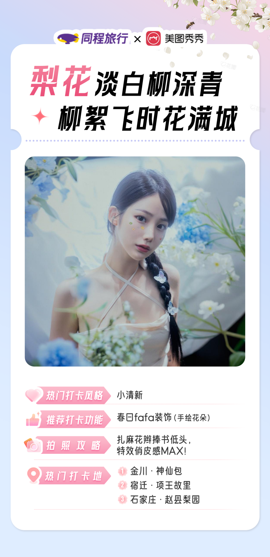 比拟其他花草的艳丽,梨花更适合小清爽摄影气概。美图秀秀用户能够照顾书本之类的文艺风道具打卡。春日手绘花朵的粉饰也能为梨花打卡照添加空气感。同程旅行平台上,金川的仙人包、宿迁项王家园和赵县梨园是赏梨花的抢手打卡地。为便利自驾用户前去城市郊外赏花,同程租车推出了踏青专属勾当,用户登录勾当页面最高可领取1096元每日租车券,轻松全国自驾赏花之旅。