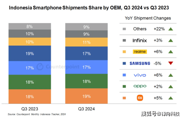 数据是来自出名调研机构Counterpoint Research,这个调研机构正在12月5日发布了全球八大智妙手机市场2024年第三季度的演讲,上图是关于印尼市场的。演讲显示正在2024年第三季度印尼智妙手机市场排名第一的品牌是小米,市场份额为19%,同比增加5%,市场份额为18%,同比增加2%,市场拥有率持平。市场份额为17%,同比增加6%,市场拥有率持平。排名第四的是三星,市场份额为17%,同比下降5%,市场拥有率下降两个百分点。排名第五的是realme,市场份额为11%,同比增加6%,市场拥有率添加一个百分点。排名第六的是传音,市场份额为9%,同比增加3%,市场拥有率下降一个百分点。
