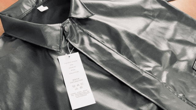 这件皮衣用的是环保的PU面料,它的皮质光泽度很是好,细看油蜡皮质感、皮纹平均清晰,这种质感一般都是三位数以上的皮衣才有的。